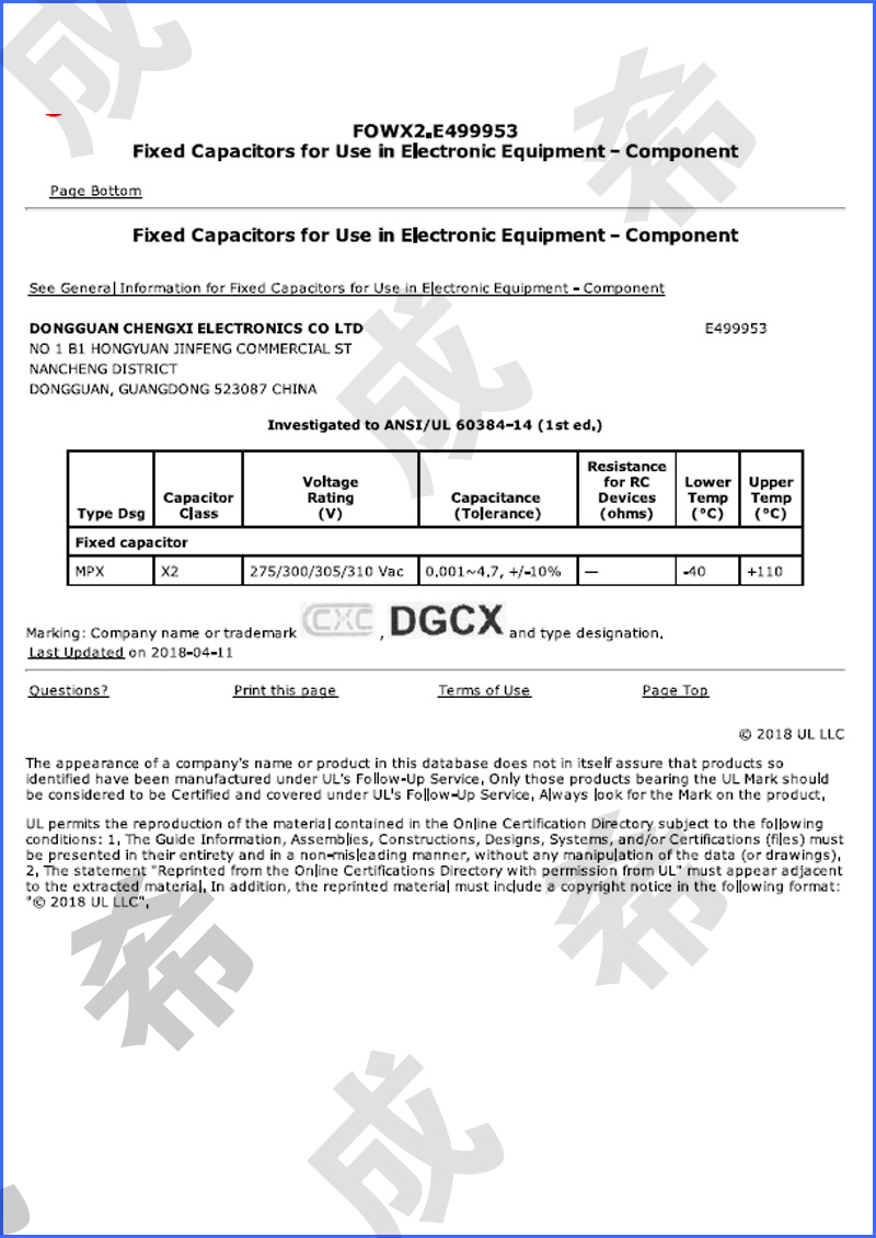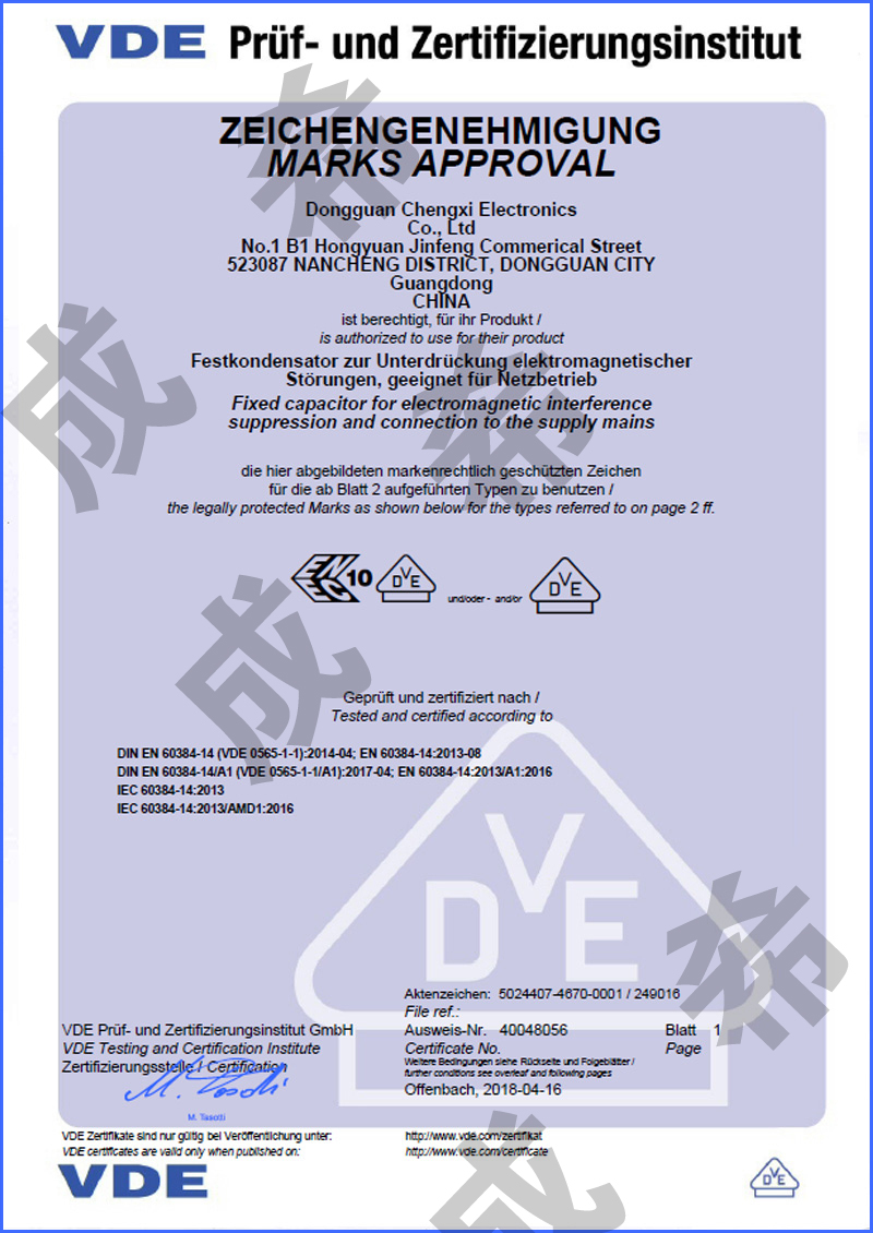 公司通過(guò)ISO9001:2015質(zhì)量管理體系;ISO14001:2015環(huán)保管理認(rèn)證.安規(guī)X、Y電容、壓敏電阻通過(guò)CQC、UL/CUL、TUV、ENEC等安全認(rèn)證,產(chǎn)品符合RoHS、REACH、HF環(huán)保認(rèn)證。